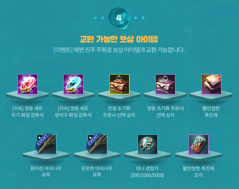 그렇게 며칠 동안 해변 진주 주화를 모은 뒤 위의 보상 아이템들로 교환이 가능합니다.
