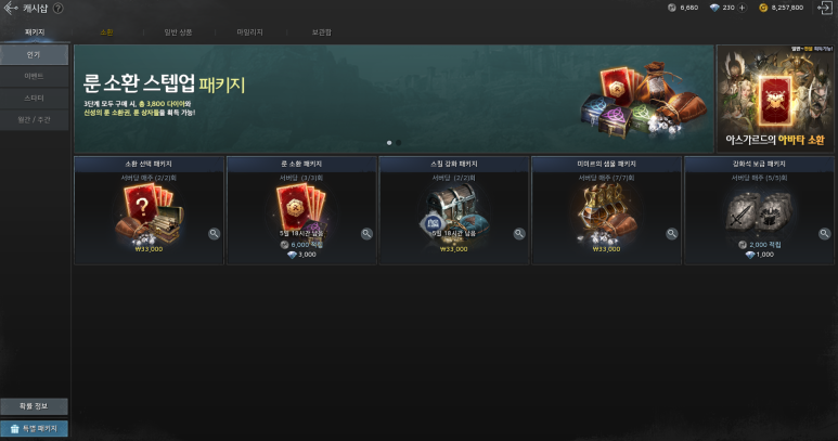 캐시샵 첫 화면이고, 패키지들입니다. 위에 말했다시피 무과금이라 패키지는 다루지 않겠습니다.