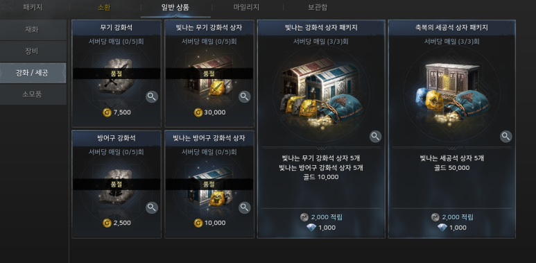 이런 식으로 팔 수 있는 물품은 판매한 뒤, 다이아를 모아서 우선적으로 필요한 물품들을 구매하는 겁니다.