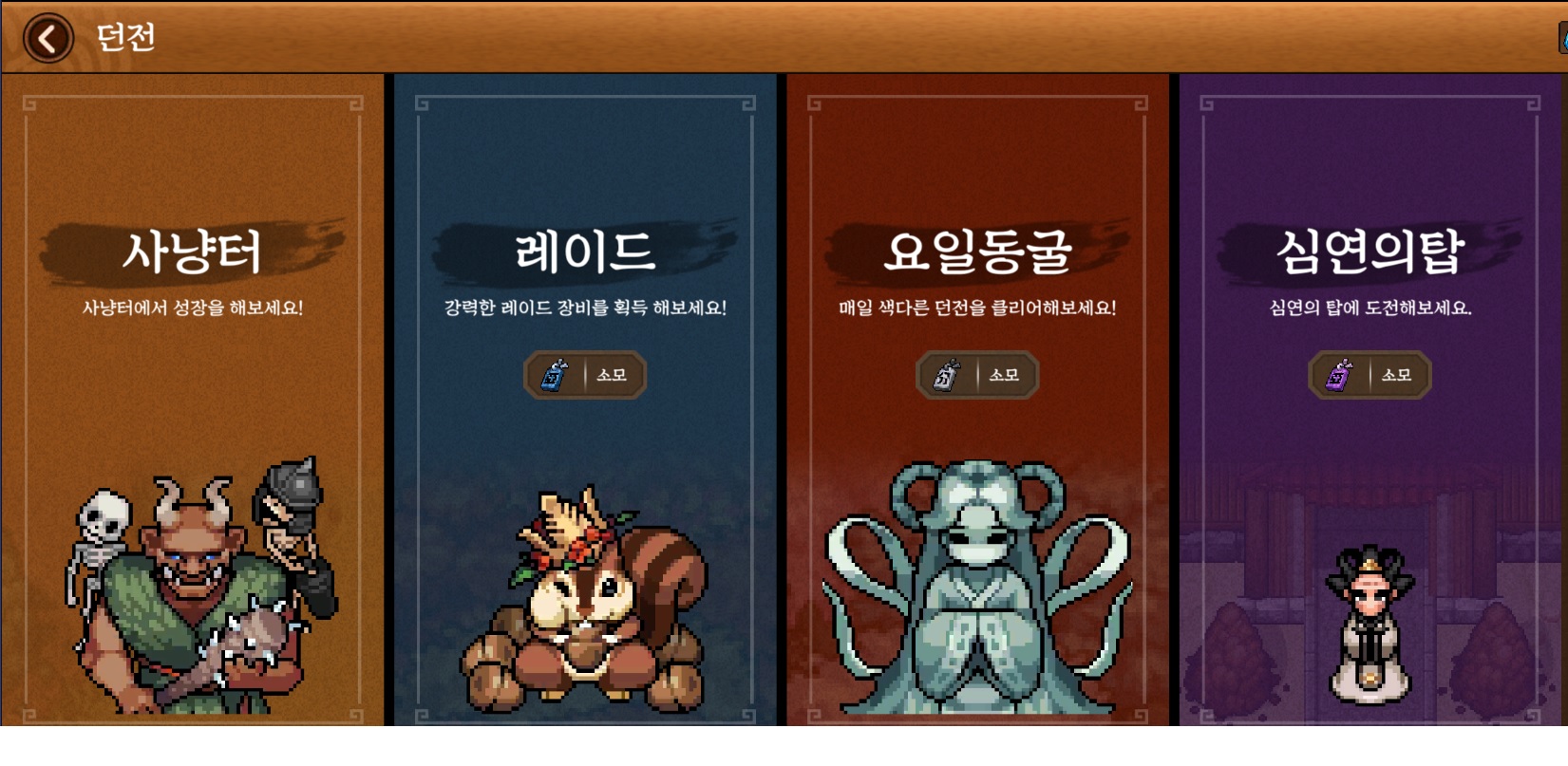 좌측부터 필드 사냥터(이동), 일반 레이드, 요일 동굴, 심연의 탑