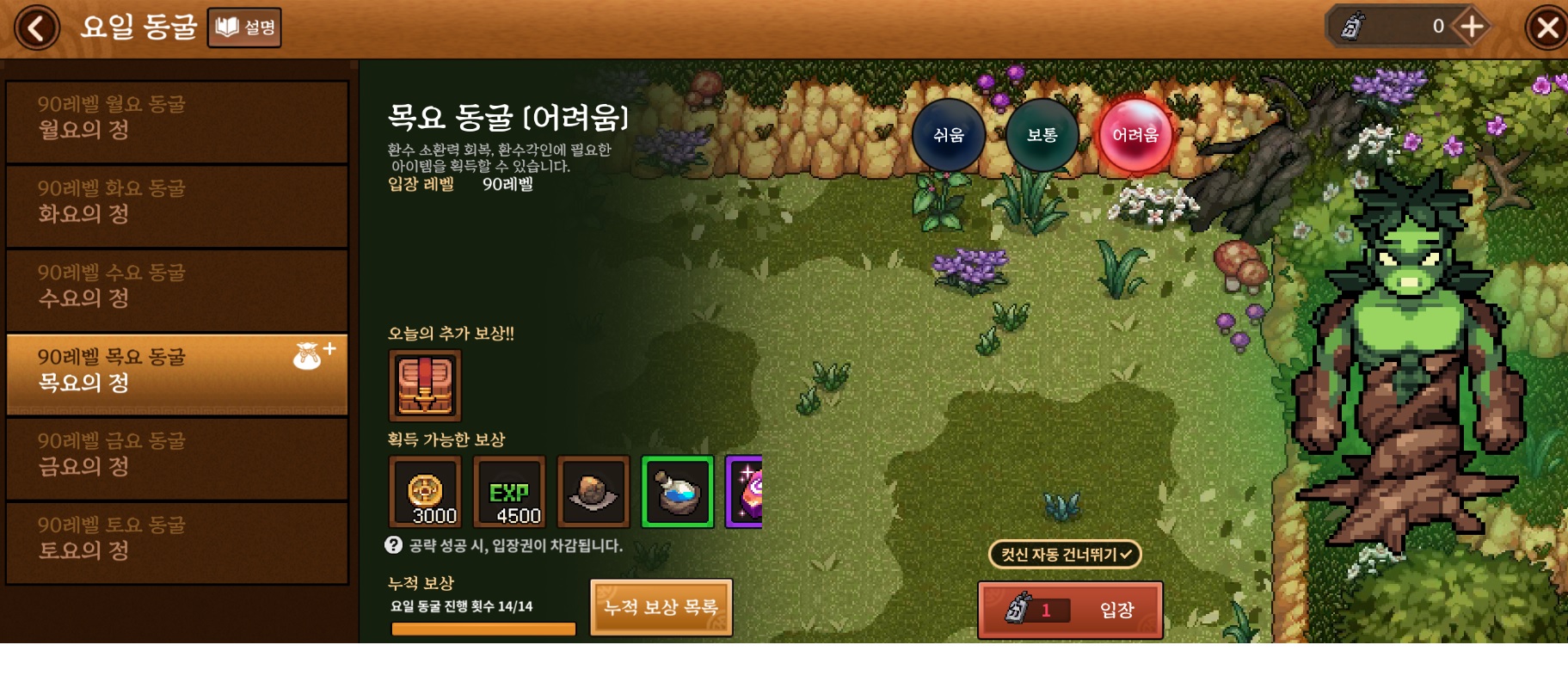 요일 동굴 콘텐츠 입니다. 요일별로 던전이 다르고, 보상 또한 다릅니다.